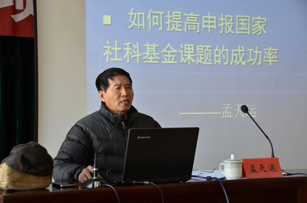 孟天运以《如何提高申报国家社科基金课题的成功率》为题,结合自己多年的申报经验,从审批国家社科基金的三关、研究形势吃透文件精神、课题申报书各个部分的填写及注意事项等方面进行了深入浅出的讲解。