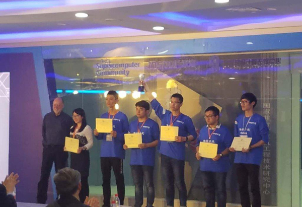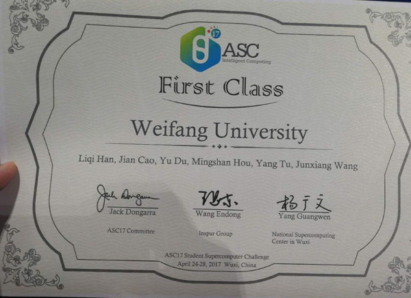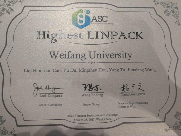 本网讯 4月28日,在国家超级计算无锡中心举行的2017ASC世界大学生超级计算机竞赛(ASC17)总决赛圆满落下帷幕,由潍坊学院计算机工程学院曹剑(队长)、杜雨、侯明山、涂阳、王俊翔等5名在校大学生组成的代表队,在韩立奇、李晓波两位老师的指导下,经过5天的激烈角逐,最终,第一次闯入总决赛的潍坊学院代表队在HPL项目上,战胜同时晋级总决赛的全球其他19支高校代表队,创造了在3000W功耗约束条件下每秒31.7万亿次的浮点运算速度,一举打破31.15万亿次/秒的国际超算竞赛HPL计算性能世界纪录,波兰华沙大学、香港浸会大学和清华大学也表现出色,分别以29.79万亿次/秒、29.43万亿次/秒和27.55万亿次/秒的成绩紧随其后,竞争十分激烈。我校代表队赢得最高计算性能奖。