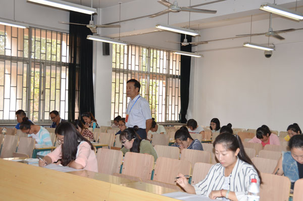 本网讯 9月16日,全国英语等级考试(PETS-3笔试部分)在我校举行。我校共设置全封闭考场66个,1900余名考生参加了考试。这是我校首次承办此项考试。潍坊市招生考试院派出以纪委书记董玉臣为组长的11人巡视组来校巡考。副校长朱猷武带领成教学院负责同志到考场进行了巡视。