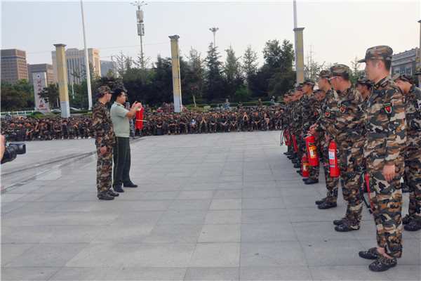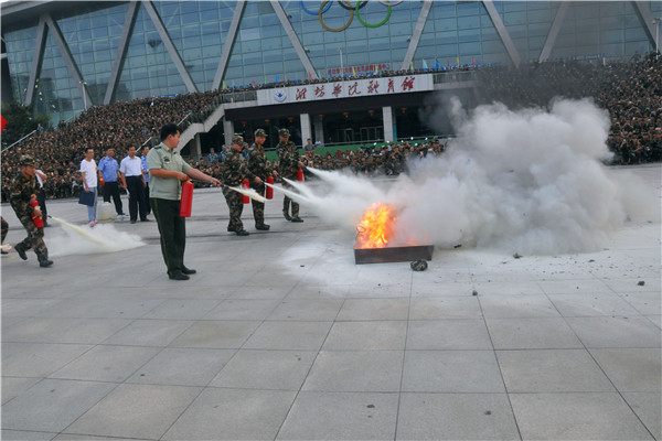 安全课后,在窦守钊的指导下,三十名新生代表在体育馆外的广场上进行了消防灭火实战教学演习,现场演示了消防栓的操作方法。