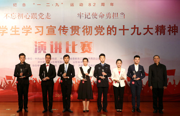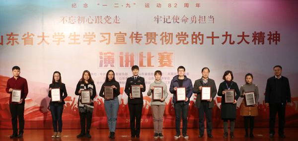 本网讯 12月9日,“不忘初心跟党走牢记使命勇担当”全省大学生学习宣传贯彻党的十九大精神演讲比赛决赛在山东济南举行。经过激烈角逐,我校选送的播音与主持艺术专业2016级高歌同学获得全省第7名的好成绩,荣获二等奖。学校获得“优秀组织奖”。