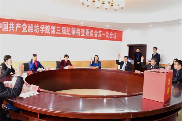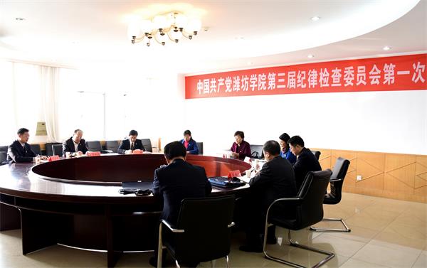 本网讯 1月19日上午,中国共产党潍坊学院第三届纪律检查委员会第一次全体会议在办公楼701会议室举行,马茜华同志主持会议,新当选的9名第三届纪委委员参加会议。