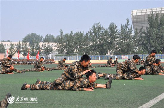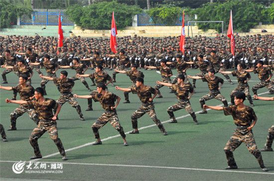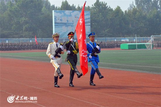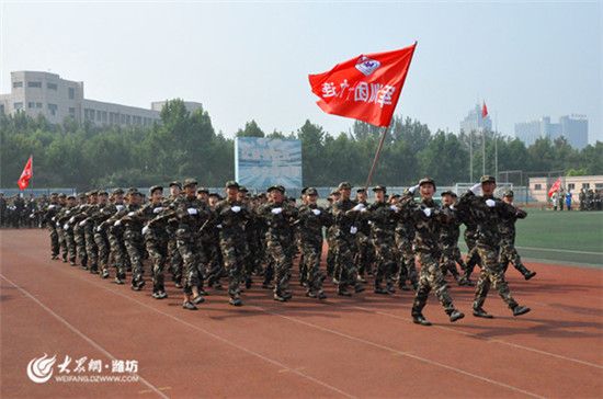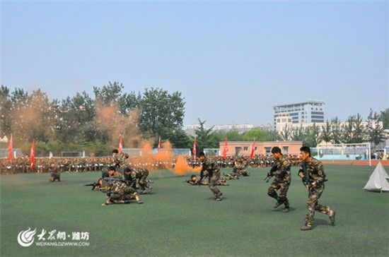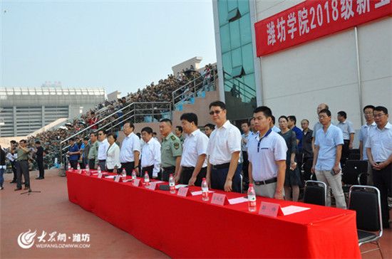 9月22日,2018级新生军训汇报表演暨表彰总结大会在潍坊学院体育场举行。潍坊学院领导孙文亮、冯滨鲁、马茜华、赵光强、王旭升,承训部队的副部队长刘坦克中校、高新区人民武装部副部长齐瑞民出席了大会,大会由潍坊学院党委副书记王清明主持,学校各二级学院、各部门主要负责同志参加了会议。军训团团长少校邵帅主持军训科目表演。