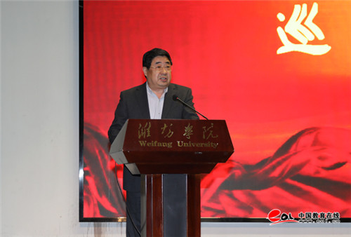 潍坊学院领导冯滨鲁、王清明、马茜华、朱猷武、赵光强、王旭升,处级干部,各二级学院学工办、团总支负责人,学生代表聆听了报告。