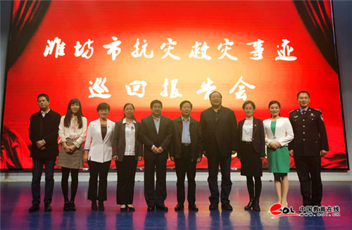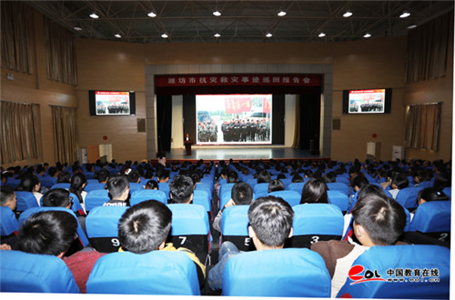 为弘扬抗灾救灾精神,进一步动员全市上下团结一致、万众一心,坚决打赢灾后重建攻坚战,潍坊市委宣传部、潍坊市文明办牵头组建了抗灾救灾报告团,在全市开展巡回报告。10月24日,报告团来潍坊学院举办巡回报告会,5名来自我市抗灾救灾战线的报告团成员分别作报告。报告会由潍坊学院党委书记孙文亮主持。