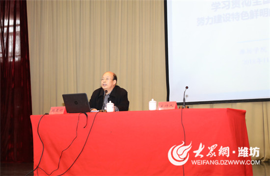 11月22日,潍坊学院学习贯彻全国教育大会精神宣讲报告会在闻韶楼报告厅举行。全国教育大会精神“山东宣讲团”成员、潍坊学院教师教育学院副院长魏晨明教授作宣讲报告。潍坊学院领导孙文亮、冯滨鲁、马茜华、朱猷武、赵光强出席宣讲会。