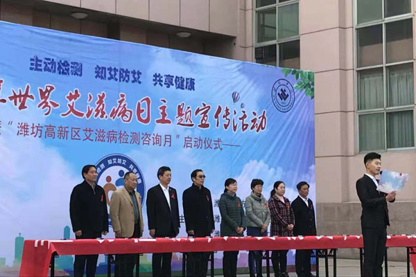 本网讯 2018年12月1日是第31个世界艾滋病日,今年宣传主题是“主动检测,知艾防艾,共享健康”。12月1日上午10点在行政楼北广场,潍坊学院、潍坊市疾控中心与潍坊高新区卫计局联合举办“艾滋病检测咨询月”启动仪式,同时,校医院组织大学生红十字协会志愿者,在第二餐厅前开展了防治艾滋病万人签名、红丝带传递等系列宣传教育活动。