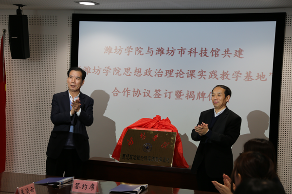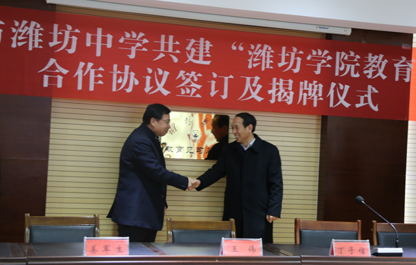 当日下午,我校与潍坊中学共建“潍坊学院教育见习基地”合作协议签订及揭牌仪式在潍坊中学举行。丁子信与潍坊中学校长王伟共同为基地揭牌。
