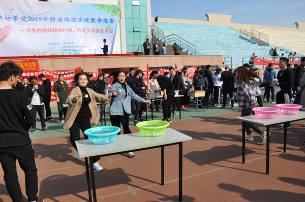 本网讯 3月22日下午,我校联合潍坊市结核病防治中心、潍坊高新区卫生和计划生育局,在学校体育场举办了“潍坊学院2019年防治结核病健康夺冠赛”。副校长王旭升、潍坊市卫健委副主任王象斌分别做了讲话,学生代表宣读了“百千万结核病防治志愿者招募倡议书”。开幕式上为“结核病防治知识网络竞赛活动”中7个优秀组织单位颁发了奖状。