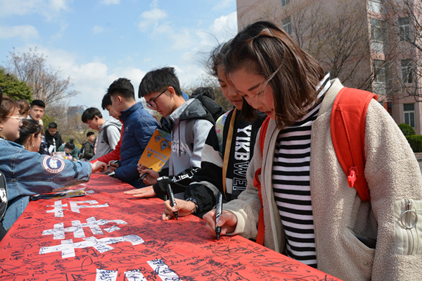 现场的志愿者还向过往的同学发放了世界水日宣传画,节水小知识。很多同学主动在“坚持节水优先,强化水资源管理”的宣传条幅上签字,同时也签下了一份节水护水的约定。