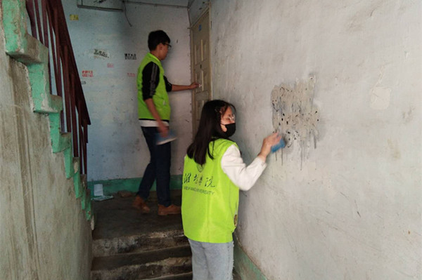 清除社区卫生死角、入户宣传惠民政策、走访登记居民信息......志愿者们深入城乡结合部、钻进绿化带,志愿者们使出了“十八般武艺”,尤其是清理小广告,小铲子、钢丝球,铲的铲、刮的刮,把平时了解到的各种方法都使出来了,干得热火朝天,只为了能尽快清理干净小广告。清理绿化带也很麻烦,外围的垃圾需要用扫帚扫、用工具捡,绿化带内的垃圾更难处理,志愿者们只能进入绿化带中,戴上手套,用手将每一块垃圾、每一片落叶装进垃圾袋。