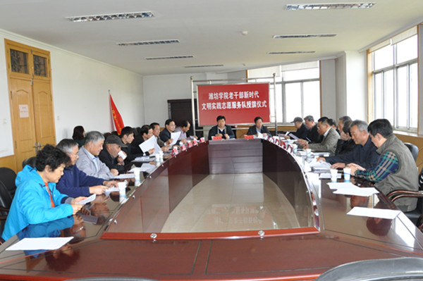 本网讯 4月16日,潍坊首支高校老干部新时代文明实践志愿服务队伍——潍坊学院老干部新时代文明实践志愿服务队在我校正式成立。这支队伍是为充分发挥老干部们政治优势、经验优势、威望优势和作用,多渠道、多方位满足老干部们的精神需求,引导老干部保持老骥伏枥、老当益壮的健康心态和进取精神,本着学养相彰、开放融合、老有所为的工作理念,激励老干部们用自己的特长服务社会、服务潍坊、服务群众。校党委副书记王清明出席成立仪式并向志愿服务队队长授旗。市委宣传部二级调研员刘西海出席仪式,离退休处相关负责同志、志愿服务队成员参加了仪式。