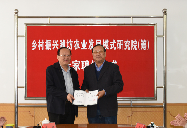 孙文亮在致辞中指出,为进一步发挥我校潍坊人才智力高地作用,深入开展乡村振兴战略研究,积极打造齐鲁样板,引领和推动潍坊市乡村振兴走在全国前列,我校拟联合潍坊市社科联、发改委、农业局等单位成立乡村振兴潍坊模式研究院,全面推进乡村振兴战略的理论研究、政策研究、咨政服务、服务模式创新,聚力打造省内一流、国内知名的乡村振兴战略高端智库,更好服务潍坊农业农村发展。他表示,两位专家的加盟,必将有力提升我校乡村振兴潍坊模式研究院的建设水平。
