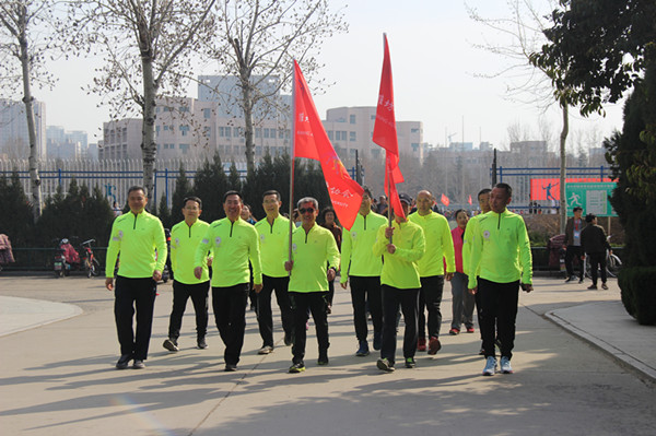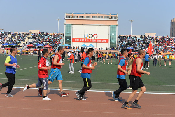 本网讯 4月18日,学校第十八届田径运动会开幕。学院教职工跑步协会首次参加本届盛会,会员赛前进行了合影留念。协会会员几乎参加了所有的比赛项目,赛出了风格,赛出了水平,取得了优异成绩,特别是在万米长跑项目中就有8人参加。每位参赛会员顽强拼搏,以良好的姿态,高昂的斗志,不以成绩为目的,而秉承协会“我运动,我健康,我快乐”的宗旨,向广大师生传播健康运动理念,展现了靓丽风采和奋发向上的精神风貌。运动会场上跑协旗帜飘扬,渲染了整个会场,调动起了全场观众情绪,弘扬了潍院体育精神。