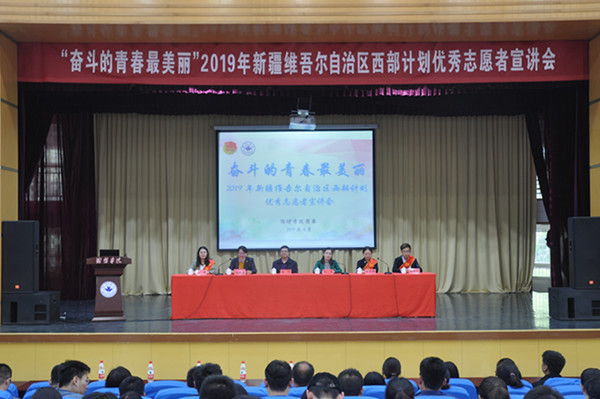 本网讯 4月24日上午,2019年新疆维吾尔自治区西部计划优秀志愿者宣讲会在闻韶楼报告厅举行。山东省志愿者行动指导中心活动部部长刘杰、新疆自治区和田地区团委副书记颜伟出席会议,各学院团总支负责人、应届毕业生代表近300人参加了宣讲会。