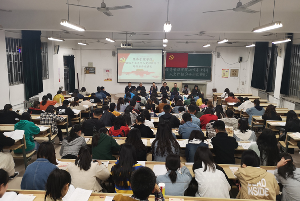 本网讯 4月23日,致远楼6401教室,鲜红的党旗悬挂于教室正前方,同学们按座次整齐到位,经济管理学院2019年上半年入党积极分子培训班正式开班。党总支书记郎益伟、副书记王海梅,党总支组织员、学生党支部委员会委员,105名入党积极分子参加开班式。