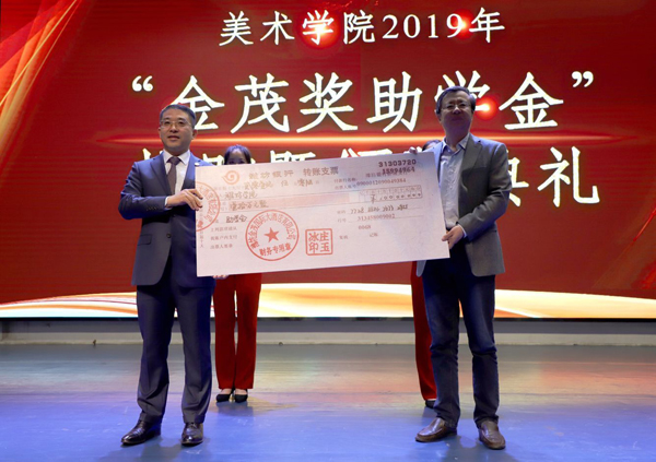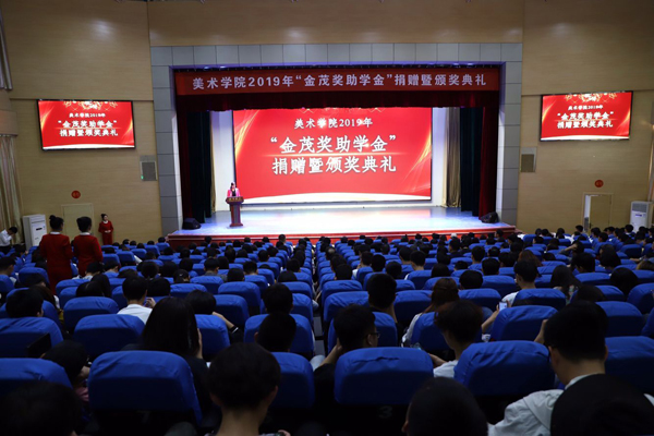 本网讯 5月10日,2019年“金茂奖助学金”捐赠暨颁奖典礼图书馆报告厅举行。学校党委副书记王清明出席典礼并致辞。潍坊金茂国际大酒店有限公司董事长庄玉冰、总经理宋宏杰、副总经理王迎春等,学生工作处、美术学院有关负责同志及师生代表500余人参加。