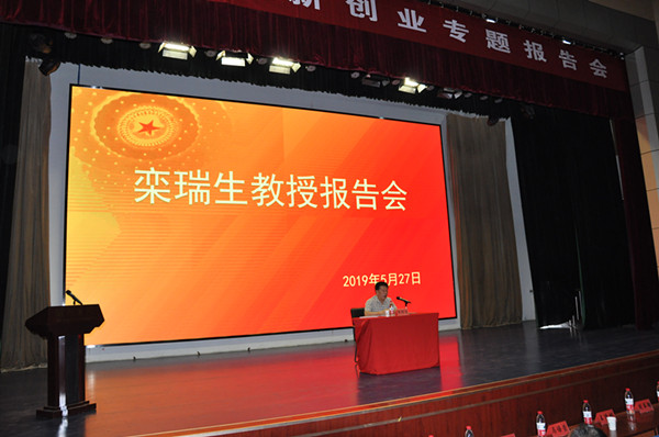 本网讯 5月27日,我校2019年大学生创新创业专题报告会在图书馆报告厅举行,邀请到著名社会活动家、演讲家、和营销服务专家栾瑞生先生作专题报告。学校党委副书记王清明、山东金色鱼塘网络科技公司总经理刘书瑜先生出席报告会。各二级学院分管学生工作的负责人、全体辅导员老师和学生代表参加报告会。