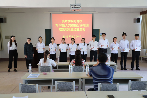 本网讯 5月29日,美术学院第三十期入党积极分子培训班结业典礼暨成果展示活动在分党校教室1501举行,学院党总支书记、分党校校长于建华,党总支副书记、分党校副校长刘雪梅,全体组织员、辅导员、学生党员及参加本期培训的入党积极分子112人参加,学生党支部书记、分党校办公室主任张芳芳主持会议。