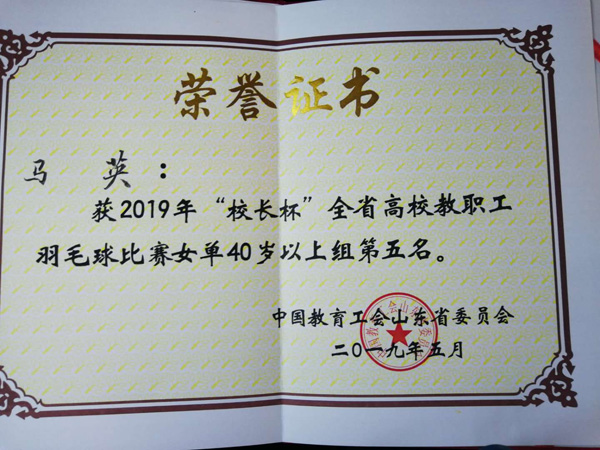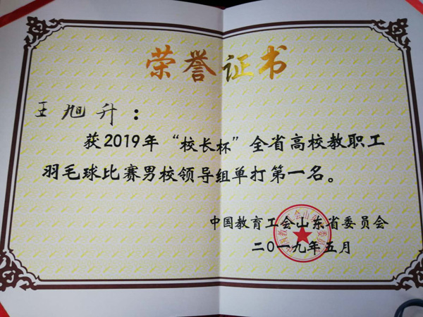 本网讯 5月27日至31日, 2019年“校长杯”全省高校教职工羽毛球比赛在鲁东大学举行。我校获“优秀组织单位奖”。副校长王旭升获校领导组单打冠军;体育学院马英老师获女单40岁以上组第5名。