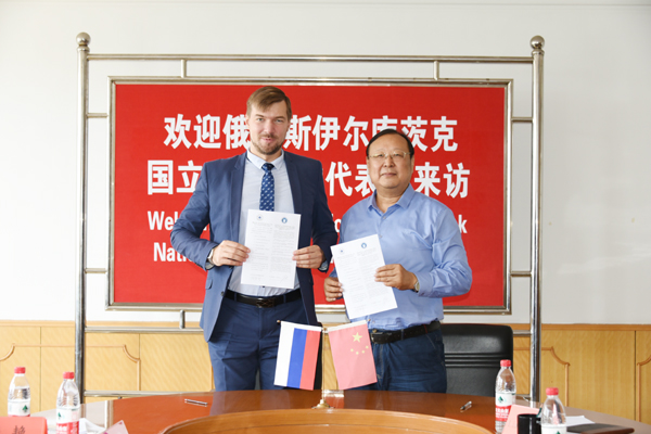 冯滨鲁对代表团一行的到访表示热烈欢迎,并介绍了学校的发展概况及与海外高校合作交流情况。萨夫金对我校的热情接待表示感谢,并介绍了伊尔库茨克国立理工大学的发展概况和专业特色。双方就在信息技术处理、生态环境、金融等领域开展校际交流合作、学生互换等多方面进行了洽谈,并签署了合作备忘录。代表团还到我校的图书馆、校史馆、名人馆和文博馆进行了参观。