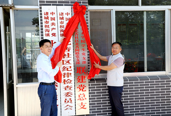 在北杏社区党委,潍坊学院正处级组织员郭建伟与诸城市委组织部副部长王刚共同为“潍坊学院美术学院学生党支部 诸城市枳沟镇北杏社区北杏网格党支部联建党总支”揭牌;潍坊学院美术学院党总支副书记、院长周晓光与枳沟镇党委副书记周春平共同为“潍坊学院美术学生党支部教育实践基地”揭牌;潍坊学院美术学院党总支书记于建华与北杏社区党委书记高成玉签署了“基层党建红色品牌培育创建合作框架协议”,双方就合作原则、合作内容、双方责任等事项达成一致意见,建立了高校基层党组织与地方红色社区党组织开展党建联建共建的长期合作关系。