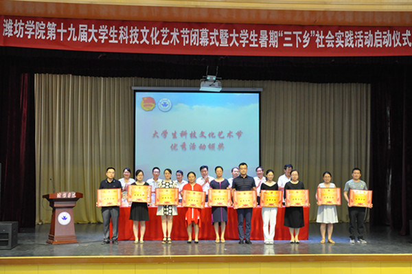 本网讯 6月26日,潍坊学院第十九届大学生科技文化艺术节闭幕式暨大学生暑期“三下乡”社会实践启动仪式在学校闻韶楼报告厅举行。学校党委副书记王清明出席仪式。办公室、宣传部、学生工作处、科研处、工会负责同志在主席台就坐,仪式由团委负责同志主持。各学院分管学生工作负责人、团总支书记(副书记)、受表彰人员、社会实践志愿者代表参加仪式。