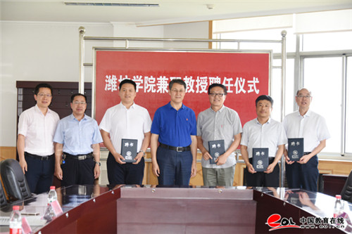 中国教育在线讯 6月12日下午,潍坊学院举行兼职教授聘任仪式,聘请山东海化集团有限公司副总经理迟庆峰、山东海王化工股份有限公司总经理孙彤江、山东龙安泰环保科技有限公司董事长代春龙以及山东联科新材料有限公司执行董事陈有根,为化学化工与环境工程学院兼职教授。副校长赵光强出席仪式,并为4位专家颁发聘书。