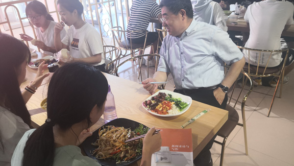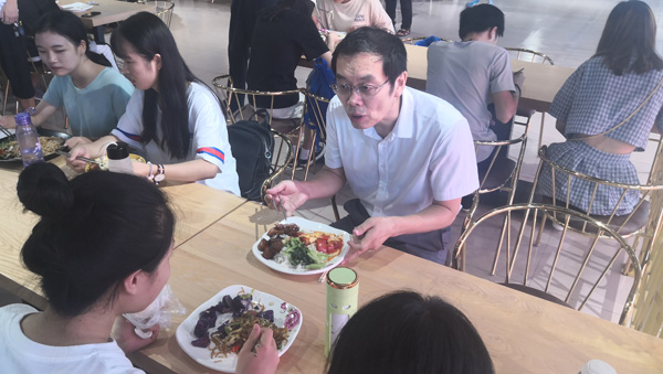 本网讯 8月28日,学校二餐二楼经中快餐饮集团重新装修后正式开始营业。为进一步了解学生对餐饮服务改革的意见和建议,当天中午,党委书记孙文亮,副校长王旭升,在有关部门负责人的陪同下,对改造后的餐厅进行检查,并与学生共进午餐。通过面对面交流,学校领导深入了解餐厅饭菜质量、价格和学生对学校餐饮改革的意见和建议。