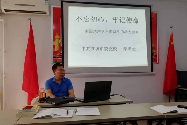柴洪泉教授从教三十多年,教学经验丰富,先后获得省、市党校系统优秀教师,山东省优秀理论宣讲员称号。他从《中国共产党党史》的角度阐述习近平总书记提出“不忘初心,牢记使命”的重大意义,为支部全体党员上了一堂生动的党史教育课。
