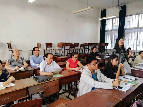 丁子信一行首先到课堂听取了外国语学院安丽老师为分级教学A班讲授的大学英语课程。