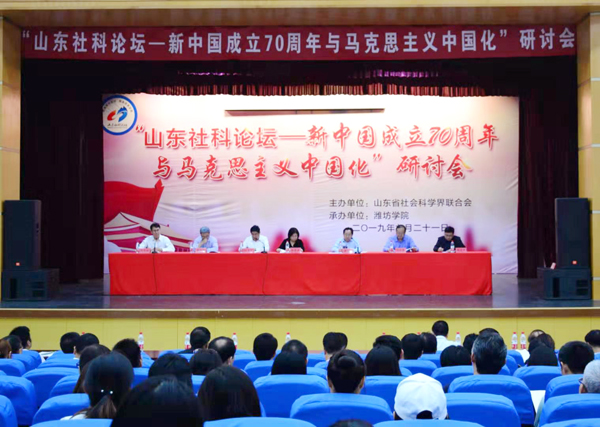 山东省社会科学界联合会党组副书记、副主席周忠高在讲话中指出,近年来,潍坊学院多次承办山东社科论坛,社会反响很好。他指出,本次论坛是山东社科界庆祝新中国成立70周年的一项重要学术活动。马克思主义中国化就是将马克思主义基本原理同中国具体实际相结合,不断形成具有中国特色的马克思主义理论成果的过程。广大社科工作者要以庆祝新中国成立70周年为契机,认真贯彻落实习近平总书记在全国哲学社会科学工作座谈会上的重要讲话,义不容辞地承担起发扬光大马克思主义的伟大历史责任,续写马克思主义中国化的新篇章。在新时代背景下,我们必须念好马克思主义“真经”,用马克思主义观察时代、解读时代、引领时代,进一步加强对马克思主义理论的研究;同时,用鲜活丰富的当代中国实践推动马克思主义发展,让当代马克思主义焕发出更加灿烂的真理光芒。要全面阐释习近平新时代中国特色社会主义思想在马克思主义发展史上、世界社会主义发展史上的重大理论贡献;同时,以高度的文化自信推进中国马克思主义国际化,为世界社会主义运动的发展提供中国智慧和中国方案,不断开辟当代中国马克思主义、21世纪马克思主义新境界。