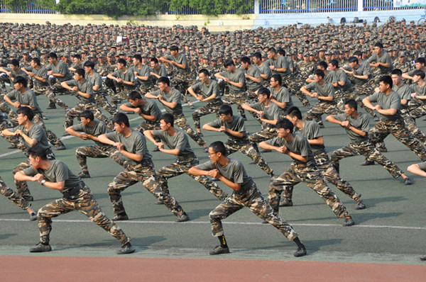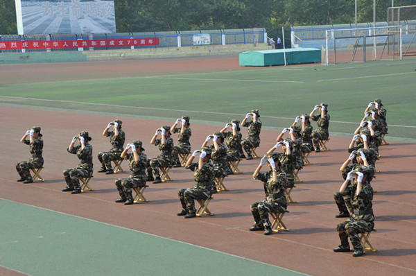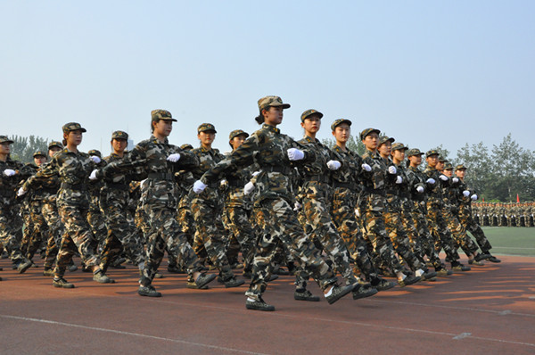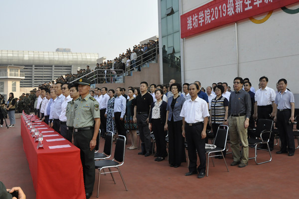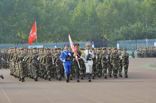 庄严的升国旗仪式后,2019级新生军训方队迈着整齐的步伐,喊着嘹亮的口号,斗志昂扬的从主席台走过,接受与会领导的检阅。之后,他们进行了正规化动作、军体拳、战术与战地救护等表演。