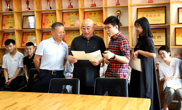 步入荟萃楼一楼庭院,王军首先兴致勃勃地观看了学院正在展示的《雕塑》与《浮雕》两门专业课的课程作业,仔细询问一件件艺术品的制作过程和工艺。他走到1208党员活动室门前,发现学生党支部和“尽美文创”团队正在开展全国党建工作样板支部育建专项活动——观看纪录片《王尽美》,便饶有兴趣地进入会场,与大家一起座谈和交流起来。王军同志认真地向大家介绍了纪录片的创作和摄制过程,他态度和蔼、语气亲切、感情真挚的神态,一下拉近了与在场所有人的距离。