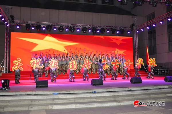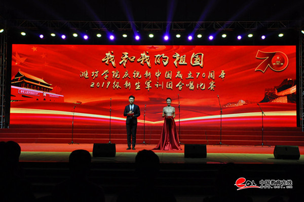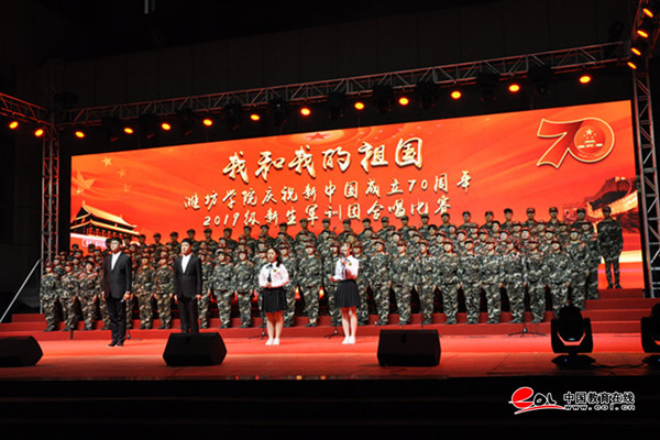 中国教育在线讯 为庆祝新中国成立70周年,9月25日晚,潍坊学院在行政楼北广场举行“我和我的祖国”2019级新生军训团合唱比赛。潍坊学院党委副书记王清明、施训部队首长出席活动现场,有关部门负责人以及全体军训教官和新生观看了比赛。