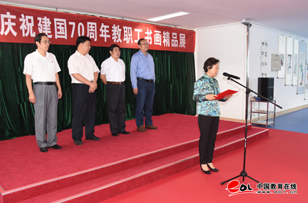 中国教育在线讯 9月26日,潍坊学院“庆祝新中国成立70周年”书法绘画作品展在行政楼八层开展。潍坊学院领导孙文亮、冯滨鲁、王清明、马茜华、王旭升出席仪式。