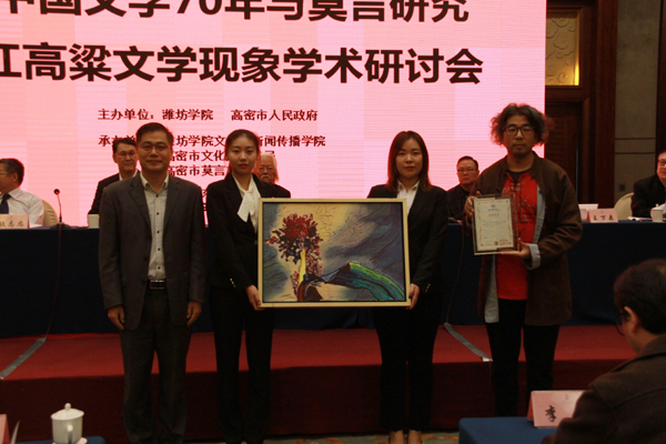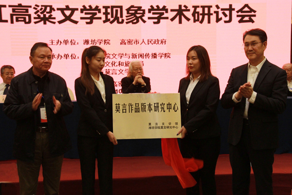 会上,赵光强、程光炜为新成立的“莫言作品版本研究中心”揭牌。赵光强为首批被聘任的莫言研究“风筝学者”“红高粱学者”“创意写作导师”“创意艺术家”等学者、作家、艺术家代表颁发了聘书。创意艺术家、高密红高粱抗战纪念馆馆长、著名画家刘铁飞先生向莫言研究中心捐赠画作《魔幻红高粱》,由中心主任王万顺博士接受捐赠并颁发收藏证书。