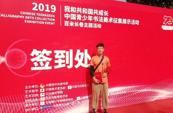 本网讯 10月20日上午,共青团中央宣传部在北京市少年宫举办2019年中国青少年美术书法展示征集之“我和共和国共成长”共绘百米长卷活动。美术学院2017级环境设计专业学生党员迟浩恩应邀参加了绘制。