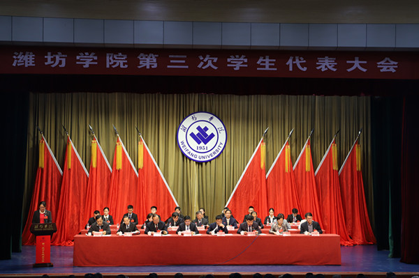第三次学生代表大会是在全校上下深入学习贯彻习近平新时代中国特色社会主义思想,扎实开展“不忘初心,牢记使命”主题教育重要时刻召开的青春盛会;是全校各级团学组织贯彻落实党的十九大精神和学校第三次党代会决策部署,深化推进团学组织改革的青春盛会;也是对我校第二次学代会以来学生会工作进行全面总结,对今后学生会工作进行深入探索和认真规划的青春盛会。本次大会是一次民主求实、团结鼓劲的大会,是一次继往开来、与时俱进的大会,是一次凝聚力量、催人奋进的大会。大会的召开,开启了学生会工作的新征程。学生会将以本次大会的召开为契机,在学校党委和省、市学联的坚强领导下,坚定不移地以习近平新时代中国特色社会主义思想为统领,坚持“围绕中心,服务大局”,以更加饱满的热情,更加坚定的信心,更加昂扬的激情,肩负起当代青年学生的使命与担当,团结带领潍坊学院广大青年学生,为加快建成优势特色突出的高水平应用型大学、为实现中华民族伟大复兴的中国梦贡献青春力量。