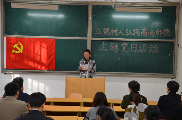 活动中,党总支书记周莹带领全体教工党员认真学习了党的十九届四中全会精神部分内容,并宣读了各支部换届选举结果,朱志远、谭静静、王鑫莉和吕静同志分别当选为两个教师党支部和两个学生党支部的支部书记。各党支部分别召开会议,开展“立德树人,弘扬高尚师德”主题党日活动,学习了习近平总书记关于师德师风建设的重要论述、教育部《关于新时代高校教师职业行为十项准则》和山东省教育厅《关于加强师德师风建设的意见》。