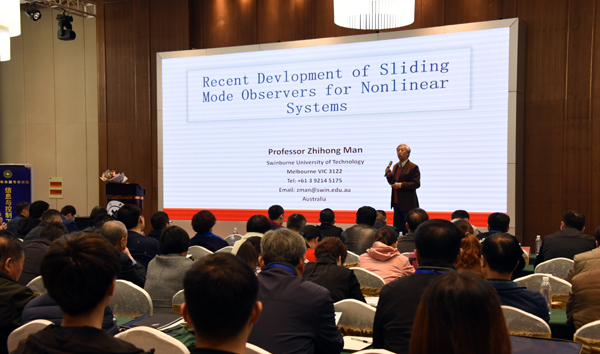 信息与控制工程专题讲座分两个阶段,第一个报告为:The Further Study of Sliding Mode Observers,由唐述宏教授主持;第二个报告为:A Self-organized Pattern Classification Based on Deep Thinking,由王文成教授主持。报告结束后,与会企业代表、教师和学生与Zhihong Man教授进行了广泛的讨论和交流。