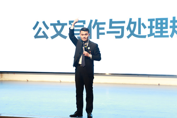 常广成以“公文写作”为题作专题报告,他用生动的表达、鲜活的事例凸显出公文写作在日常学生工作及未来工作中的重要性,他从公文写作特点和公文种类等方面详细讲解了公文写作的方法技能,强调了公文写作的法定权威性、格式规范性、执行时效性。
