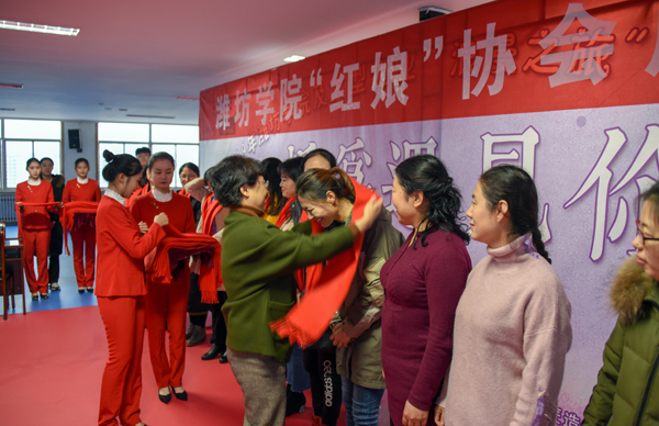 会上,马茜华依次为“红娘”佩戴红娘配饰;图书馆分会女工委员史玉华老师作了代表发言;大家共同宣读了潍坊学院“红娘”协会工作宗旨。