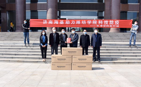 本网讯 4月28日,济南海基科技发展有限公司向我校捐赠五套智能空间空气消杀设备,总价约5万元。学校党委副书记王清明代表学校接受捐赠。