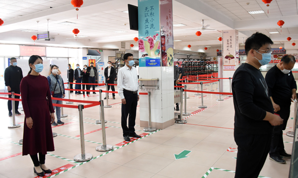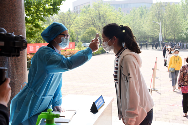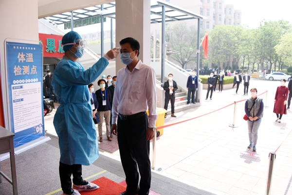 在学校南大门返校报到入口处,学生戴口罩间隔2米排队入校,依次经过行李消毒、检测体温、身份验证进入校园。设立的体温检测双通道、临时留观点,既保证了入校秩序,又确保了师生健康安全。本环节着重演练了体温异常学生返校的应急处置程序。