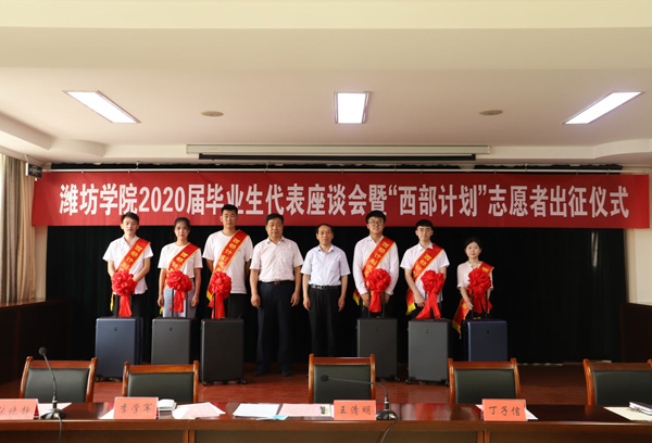 本网讯 6月24日,2020届毕业生代表座谈会暨“西部计划”志愿者出征仪式举行。党委副书记王清明、副院长丁子信出席仪式。学生工作处、招生就业处、团委等部门负责同志、2020届毕业生代表、2020年“西部计划”志愿者代表、2019届校学生会主席团部分成员参加会议。