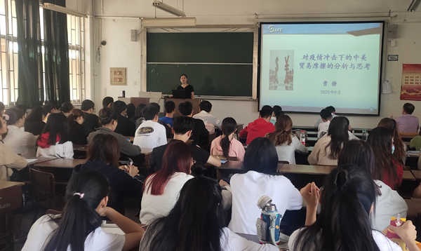 曹静作了《疫情冲击下中美贸易摩擦的分析与思考》报告,她运用大量数据对疫情冲击下中美贸易摩擦进行了深度剖析,介绍了中美贸易摩擦的历程,分析了中美贸易摩擦的本质、核心以及新冠疫情冲击下的中美关系,从宏观和微观层面提出中国的应对之策等。朱强作了《农机行业海外发展现状及策略》报告,他介绍了福田雷沃公司的基本情况,以公司对俄罗斯汽车市场分析研究为例,从宏观环境分析、市场分析、竞争分析、雷沃资源能力分析以及俄罗斯市场竞争策略和作业计划等方面,详细介绍了企业开展国际业务中的注意事项,并就国际贸易业务的渠道开发以及新媒体应用提出了自己的见解,要求同学们要开拓发展思路,拓宽知识结构,明确职业规划,追求幸福人生。