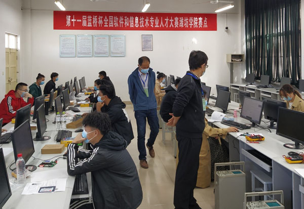 我校作为赛点之一,承接了本校155名学生的软件类和24名学生的电子类项目的比赛,从上午9点开始在天一楼计算机工程学院实验室进行。