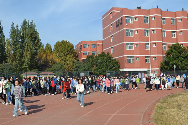 13时40分,急促的警报声在生活区响起,工作人员迅速到达指定岗位,正在公寓休息的学生紧急走出房间,在宿舍管理员的指挥下,抱头弓腰,从公寓楼两侧出口有序撤离到主干道,沿路迅速向操场安全区域集中,按班级列队清点人数并逐级上报。全校2468名学生参加了演练,整个活动严密有序,参演人员各负其责,安全撤离仅用4分30秒,演练取得圆满成功。
