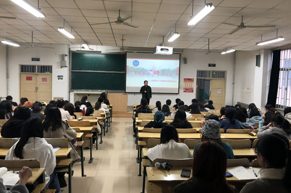 本网讯 10月29日下午,法学院2018级学生考研动员会在人合楼召开。本次大会以“不忘初心 ‘研’续青春”为主题,法学院党总支副书记曹兴波作考研动员,法学院副教授韩学志作考研指导,2018级辅导员老师及准备考研的同学参加了本次动员会。